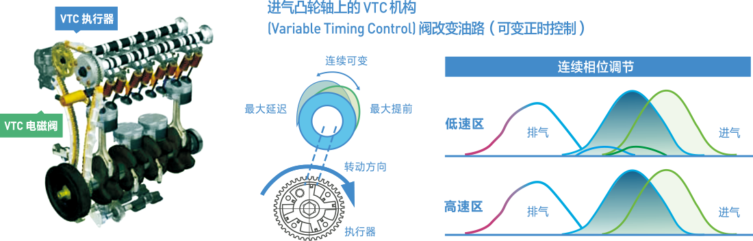 VTC控制进气门的开启和关闭正时(Timing) ,也就是控制进气门打开和关团的最大提前角和最大迟闭角。可以根据发动机不同的负荷状态,连续地调节进气门的闭合角度,使发动机运转更加顺畅,获得更好的动力性、经济性和排放的综合性能。